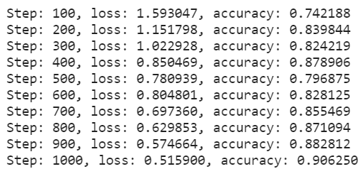 print("Step: %i, loss: %f, accuracy: %f" % (step, loss, acc))
