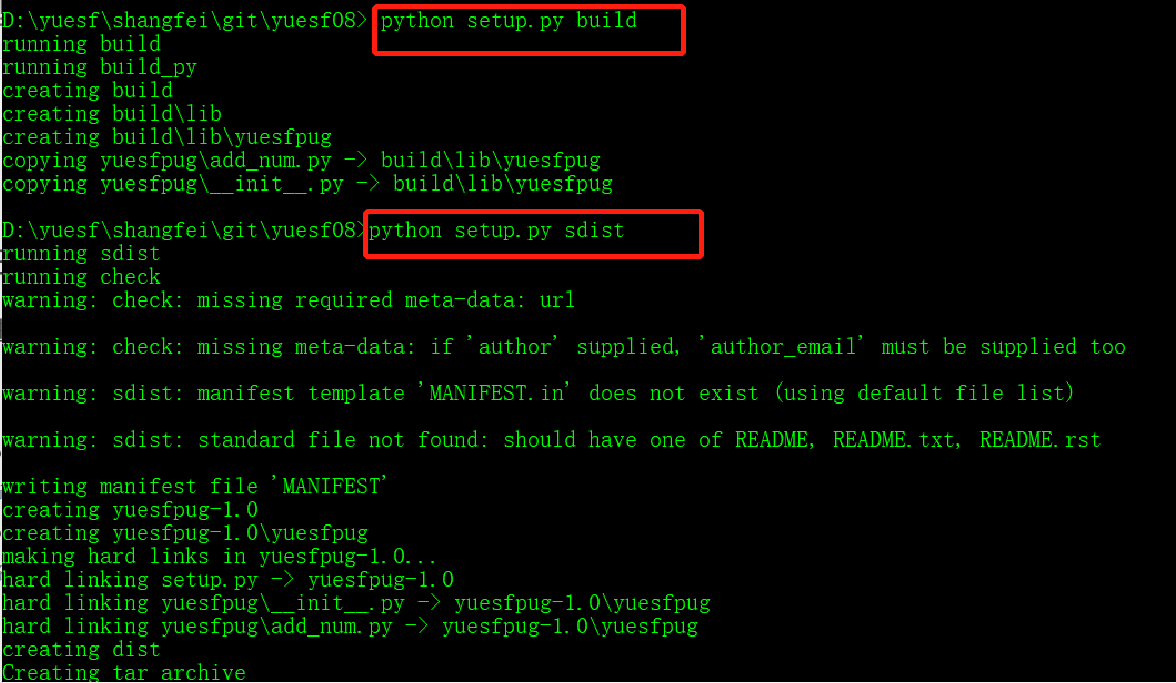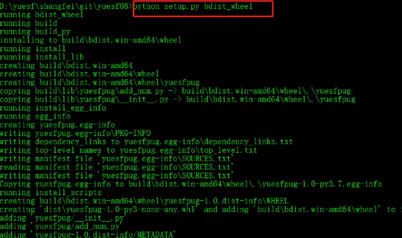 # 1. 编译 python setup.py build # 2. 生成发布压缩包: python setup.py sdist # 3. 生成网络发布包wheel文件: python setup.py bdist_wheel