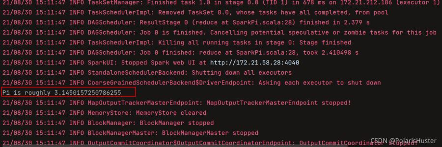 println(s"Pi is roughly ${4.0 * count / (n - 1)}")