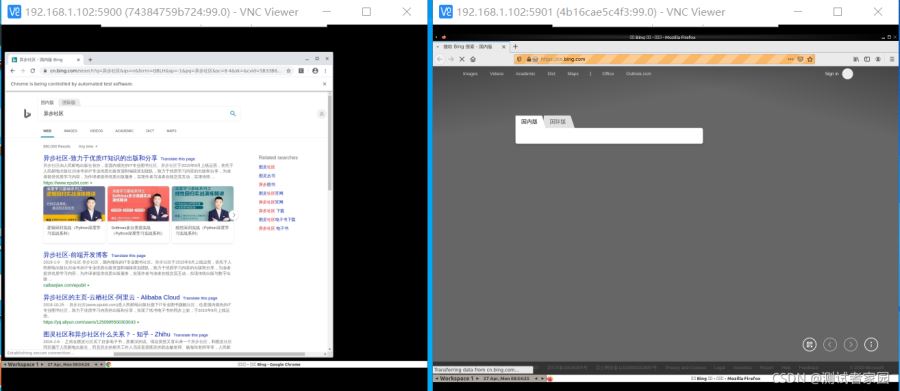 从上面的脚本,大家可以看到创建了一个名称为Test_Bing()的函数,其包含两个参数,分别是主机和浏览器。函数的执行意图就是根据远程服务器URL字符串和传入的浏览器名称字符串,在对应的浏览器中执行搜索业务,且搜索词为“异步社区”,对执行结果进行截图,截图的名称为对应浏览器名称+“_result.jpg”文件,并对搜索后的结果进行断言。需要说明的是,这里对结果进行截图的目的不仅仅是想看一下结果,还有一个很重要的原因是在使用Selenium Grid时,执行测试过程中不会出现浏览器,所以您看不到执行过程,为了证明结果的正确性我们也需要截一个图证明其确实是工作了并且执行是正确的。如果您还想看到不同的容器在执行过程中的界面,也可以使用VNC Viewer连接到对应容器(但需下载对应的selenium/node-firefox-debug和selenium/node-chrome-debug镜像文件,debug结尾的镜像都带有VNC服务端,本机安装VNC客户端,即可远程连接。5900端口为VNC Viewer的监听端口,故做了一个端口映射),如图9和图10所示。