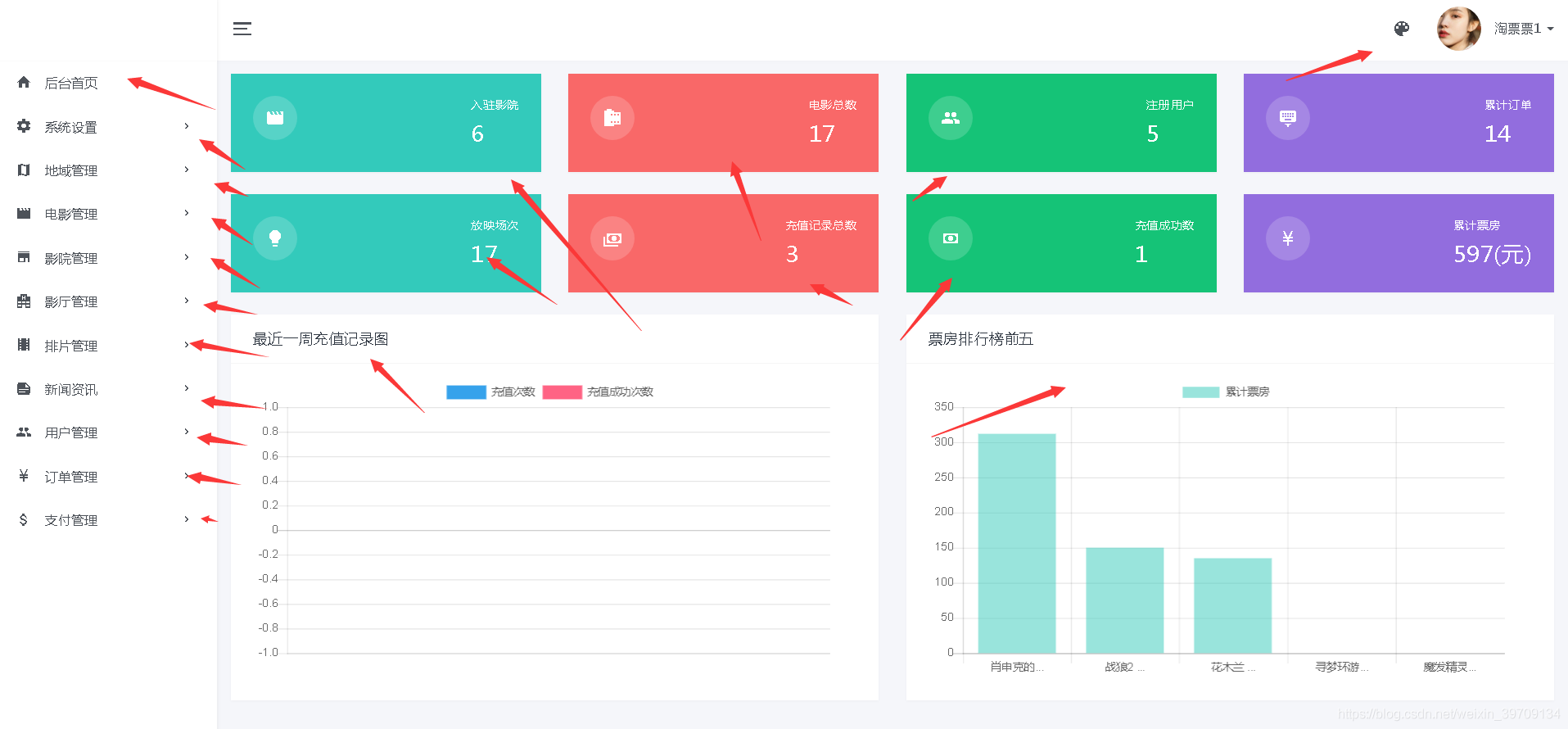 后台主页树状图大数据信息查看、对影院个数据进行统计、主要统计有、入住影院、场次、注册用户、订单信息、放映场次、充值、票房等数据统计展示。