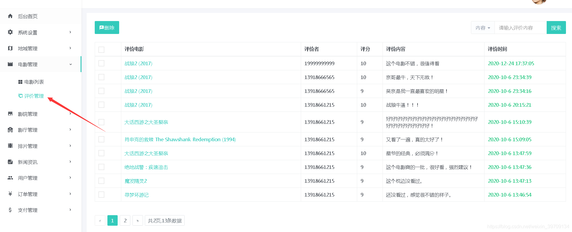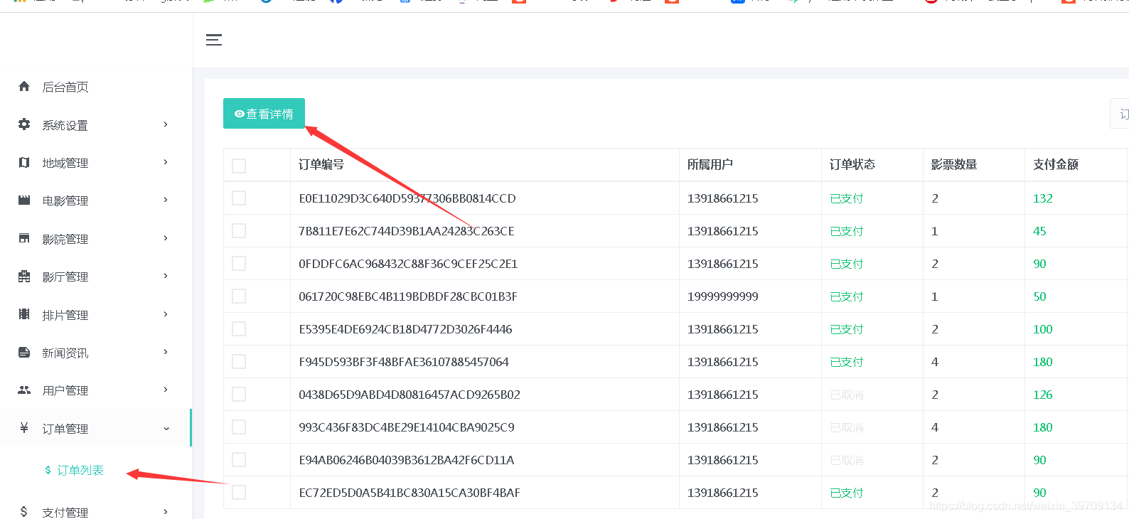 系统设置、菜单管理、用户管理、角色管理、日志管理、地域信息管理、电影管理、评价管理、影厅管理、拍片管理、资讯管理、资讯分类管理、用户管理、订单管理、支付管理等