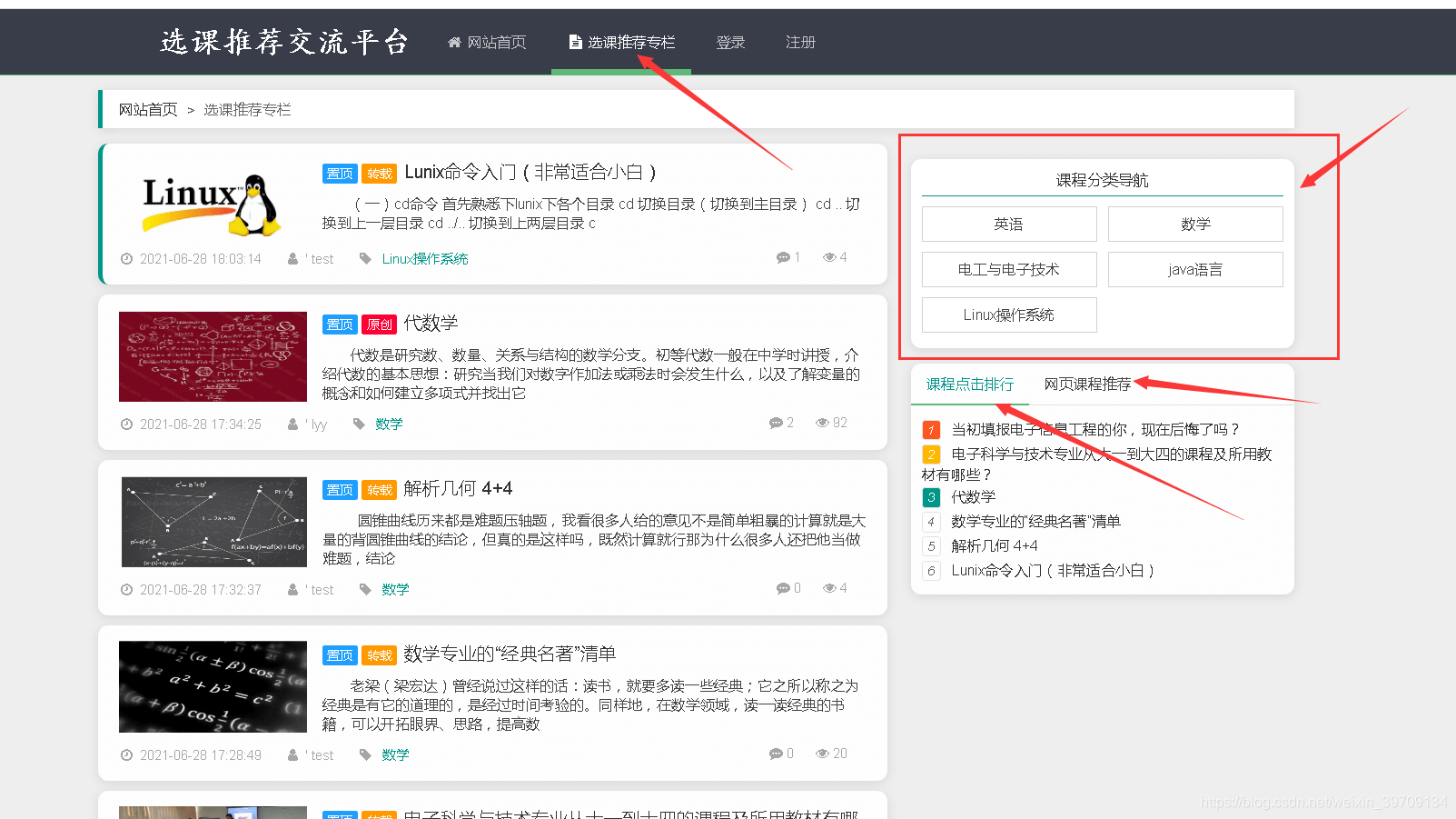 输入http://localhost/访问选课推荐交流平台首页、可以查看轮播图以及各类信息、点击进入详情页面