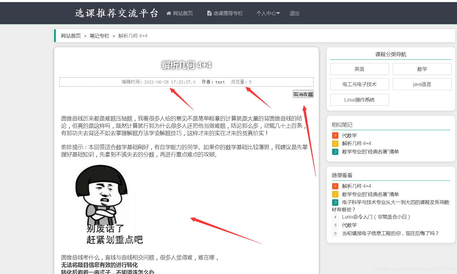 课程详情可以查看课程详情信息以及作者信息和浏览量等具体数据、也可以进行评论和收藏等操作