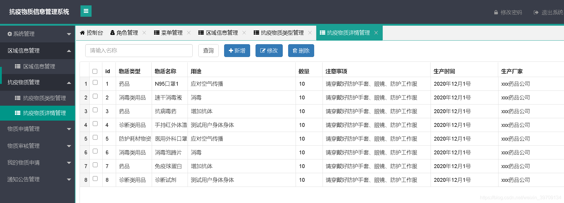 具体功能模块:用户模块、角色模块、菜单模块、部门模块以及灵活的权限控制,可控制到页面或按钮,满足绝大部分的权限需求 业务模块功能:区域管理、对不同区域的进行管理以及物质发放等、物质类型管理、物质详情管理、物质申请管理、物质审核管理、我的物质申请管理、以及系统通知公告查看等具体功能模块、以及修改密码退出等。