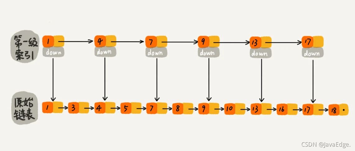 若如下图,对链表建立一级“索引”,每两个结点提取一个结点到上一级,把抽出来的那级叫作索引或索引层。图中的down表示down指针,指向下一级结点。