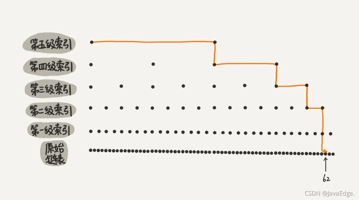原来没有索引时,单链表搜索62需遍历62个结点!