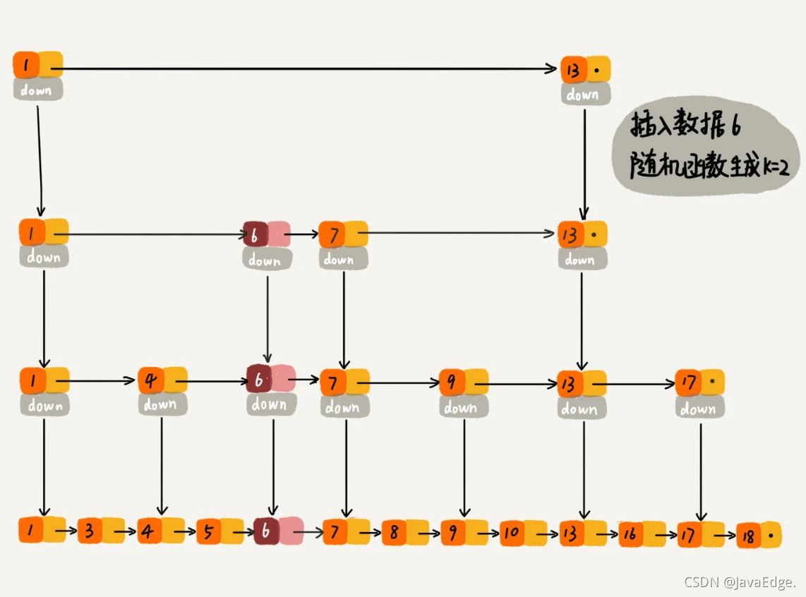 通过一个随机函数决定将这个结点插入到哪几级索引中,比如随机函数生成了值K,那就把这个结点添加到第一级到第K级这K级索引中。