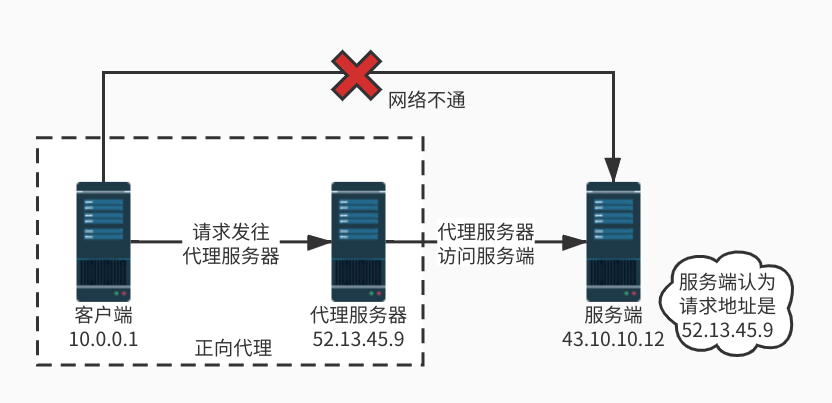 正向代理是指对客户端提供的代理服务,在客户端无法直接访问服务端的情况下,通过配置代理服务器的方式访问服务端。