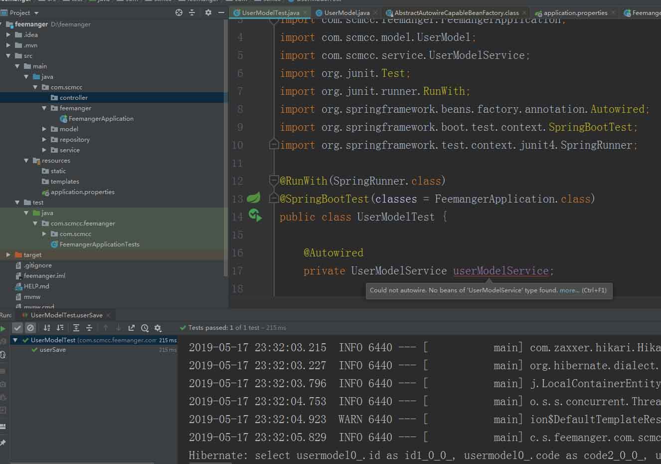 org.springframework.beans.factory.UnsatisfiedDependencyException: Error creating bean with name ‘com.scmcc.feemanger.FeemangerApplicationTests': Unsatisfied dependency expressed through field ‘userModelService'; nested exception is org.springframework.beans.factory.NoSuchBeanDefinitionException: No qualifying bean of type ‘com.scmcc.service.UserModelService' available: expected at least 1 bean which qualifies as autowire candidate. Dependency annotations: {@org.springframework.beans.factory.annotation.Autowired(required=true)}