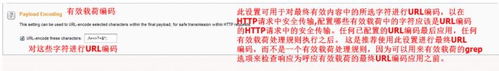 选项4:Payload Encoding 你可以配置哪些有效载荷中的字符应该是URL编码的HTTP请求中的安全传输。任何已配置的URL编码最后应用,任何有效载荷处理规则执行之后。 这是推荐使用此设置进行最终URL编码,而不是一个有效载荷处理规则,因为可以用来有效载荷的grep选项来检查响应为呼应有效载荷的最终URL编码应用之前。