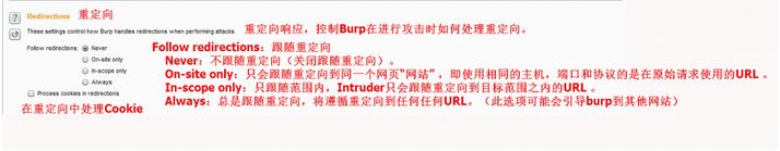选项7:Redirections 重定向响应,控制Burp在进行攻击时如何处理重定向。