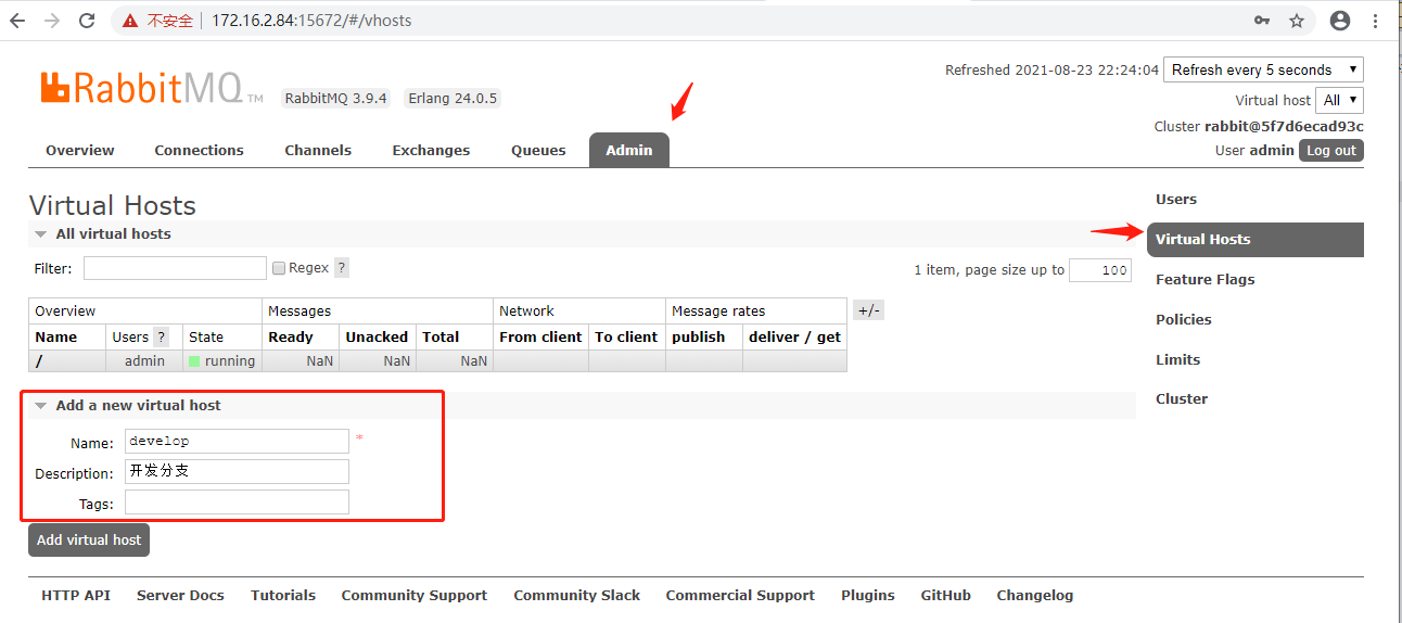 建一个名为develop的Virtual host(虚拟主机)使用,项目中一般是一个项目建一个Virtual host用,能够隔离队列。