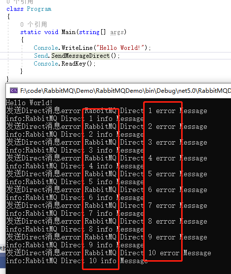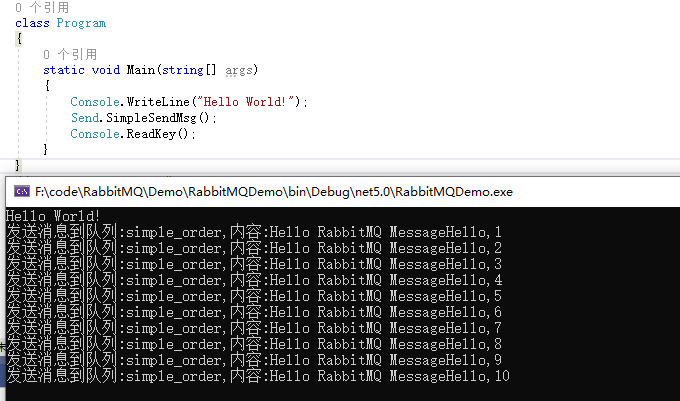 Console.WriteLine($"发送消息到队列:{queueName},内容:{message}");