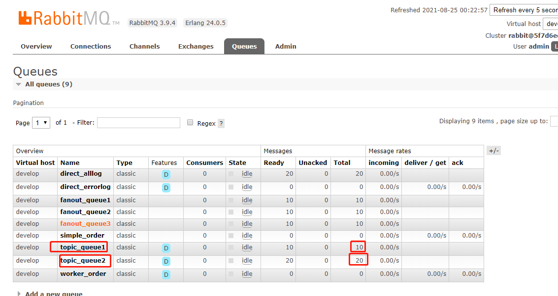 这里演示了 routingKey为aaa.orange.rabbit,和lazy.aa.rabbit的情况,第一个匹配到Q1和Q2,第二个匹配到Q2,所以应该Q1是10条,Q2有20条,
