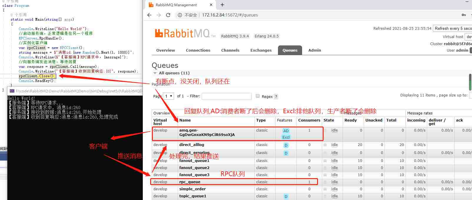 注:消费者这里有一个创建队列,它本身不需要,是预防消费端程序先执行,没有队列会报错。