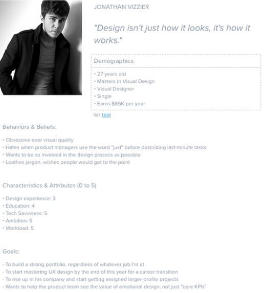 - 人物角色(User Personas):描绘出一种或多种典型目标用户的特质框架,包括他们在心理、行为、职业等方面的特征,以及这些特征与产品使用之间的关联。例如,新手用户的角色模型通常需要表现出他们的某些疑虑特征,而中高级用户的角色模型则更聚焦于快速高效的体验需求。