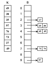 假如待排序列K= {49、 38 、 35、 97 、 76、 73 、 27、 49 }。这些数据全部在1—100之间。因此我们定制10个桶,然后确定映射函数f(k)=k/10。则第一个关键字49将定位到第4个桶中(49/10=4)。依次将所有关键字全部堆入桶中,并在每个非空的桶中进行快速排序后得到如图所示。只要顺序输出每个B[i]中的数据就可以得到有序序列了。