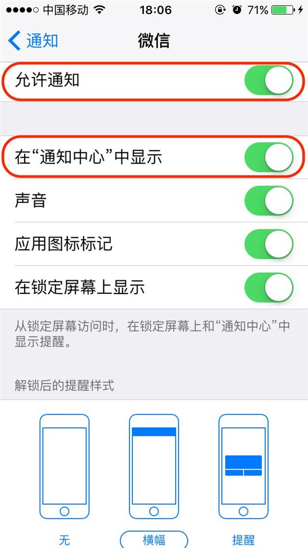之后,将下面可选项中的“在‘通知中心’中显示”,也要点开!点开!点开!