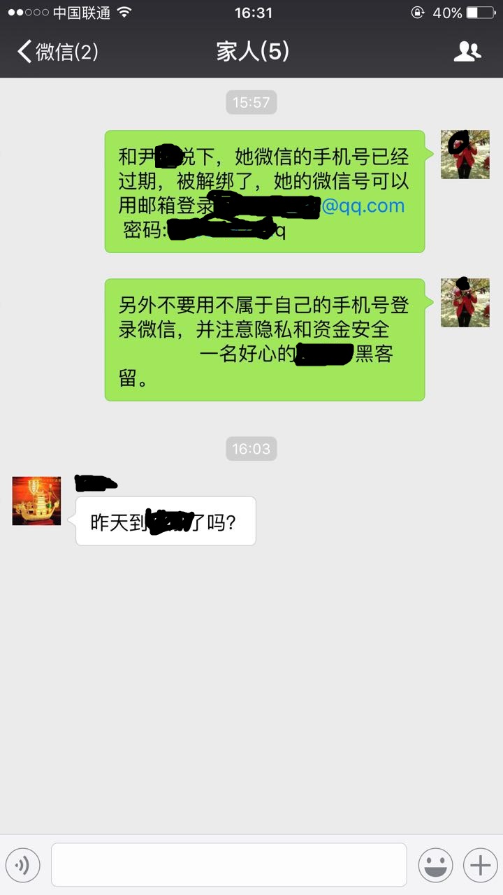 6.少妇的群聊里面有个家人群,应该是值得信任的几个人。不出所料,在家人群里面我看到了微信头像验证的那两个人。因为少妇这个微信号4小时前还在朋友圈晒娃,而且有几百好友,既然微信号还在用,当然还是不能就这么不管了。于是在家人群里告诉了新的登录方式和修改后的密码,并且提示他们注意资金安全,如果手机号不属于自己了一定要记得解绑。