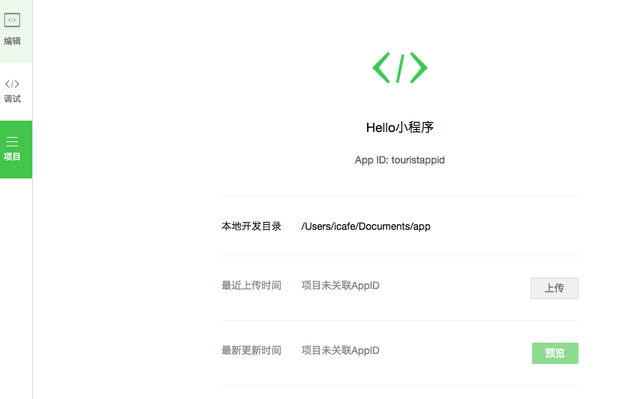 由于我的环境没有内测账号,所以在上传区域显示的是 项目未关联 AppID , 如果有了测试账号,就会显示你的 AppID 了。 目前只有内测账号才能够上传小程序。这就是唯一的差别了。没有内测账号只是不能上传,但完全可以在本地开发和测试。