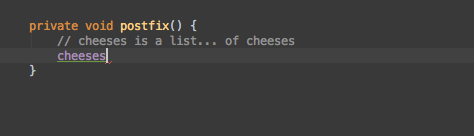 调用: 你可以在某个表达式后面输入点号,出现一个候选列表,在常规的代码补全提示就可以看到一系列后缀补全关键字,同样的,你也可以在Editor → Postfix Completion中看到一系列后缀补全关键字。