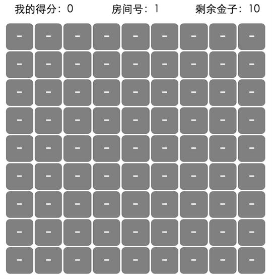 初始化状态,9x9的格子,每一格子其实都是一个button按钮。我们生成的地图场景数据,分别对应着每一格。比如1表示周边的1个金子,0表示周边没有金子,-1表示这格是个金子,我们的目标就是找到这些-1。找得越多得分越高。