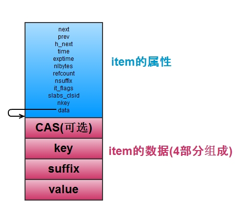 首先看memcached是如何存储数据的,即存储key-value对。如下图,每一个key-value对都存储在一个item结构中,包含了相关的属性和key和value的值。