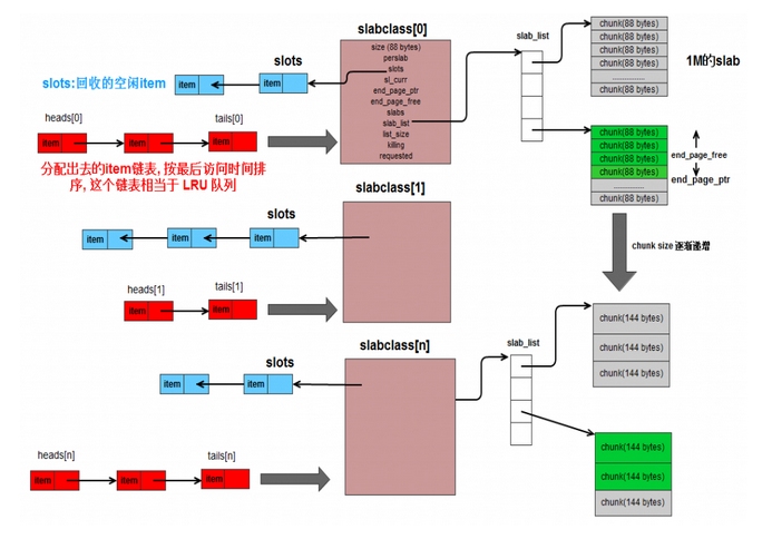 然后,每一个slabclass对应一个链表,有head数组和tail数组,它们分别保存了链表的头节点和尾节点。链表中的节点就是改slabclass所分配的item,新分配的放在头部,链表越往后的item,表示它已经很久没有被使用了。当slabclass的内存不足,需要删除一些过期item的时候,就可以从链表的尾部开始删除,没错,这个链表就是为了实现LRU。光靠它还不行,因为链表的查询是O(n)的,所以定位item的时候,使用hash表,这已经有了,所有分配的item已经在hash表中了,所以,hash用于查找item,然后链表有用存储item的最近使用顺序,这也是lru的标准实现方法。