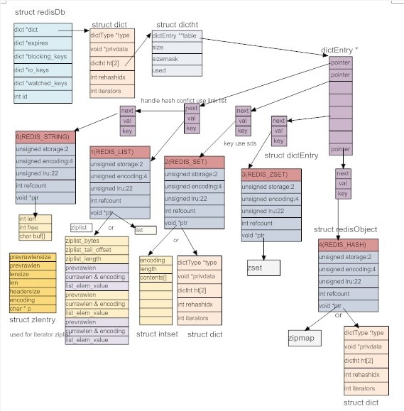 有了dict,数据库就好实现了。所有数据读存储在dict中,key存储成dictEntry中的key(string),用void* 指向一个redis object,它可以是5种类型中的任何一种。如下图,结构构造是这样,不过这个图已经过时了,有一些与redis3.0不符合的地方。