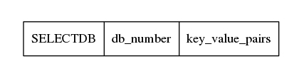 每一个数据库存储方式如下,首先一个1字节的常量SELECTDB,表示切换db了,然后下一个接上数据库的编号,它的长度是可变的,然后接下来就是具体的key-value对的数据了。
