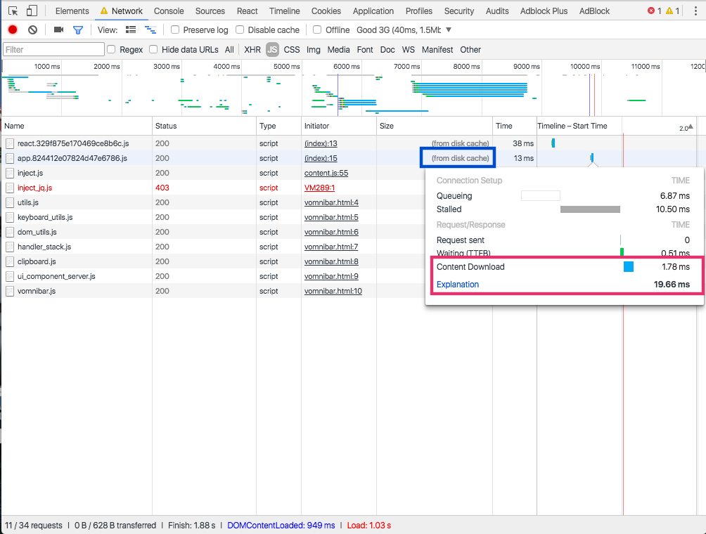 我们可以看到, 整个 app.js 共277kb, 在模拟3G网络的情况下(蓝色框框),每次加载需要花费999ms, 其中下载花费了911ms(红色框框).