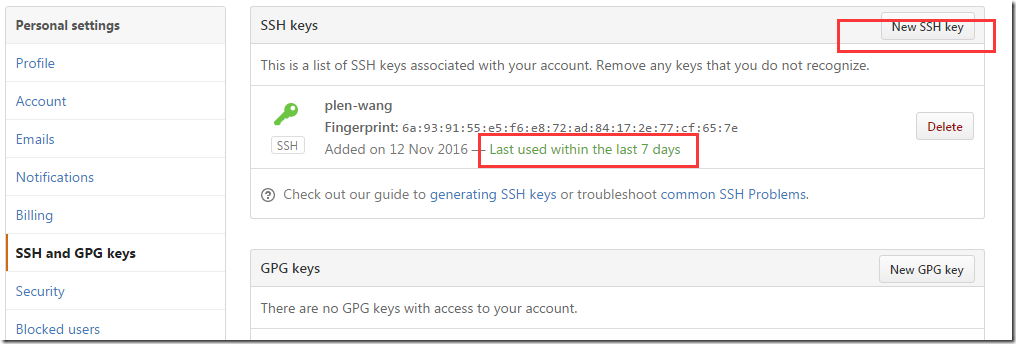 添加一个新的sshkey。每一个sshkey的使用都有时间记录。如果没有被使用过,ssh的绿色钥匙是灰色的。这样你就完成了git连接远程仓库,且可以随时push代码了。开始你的git之旅吧。