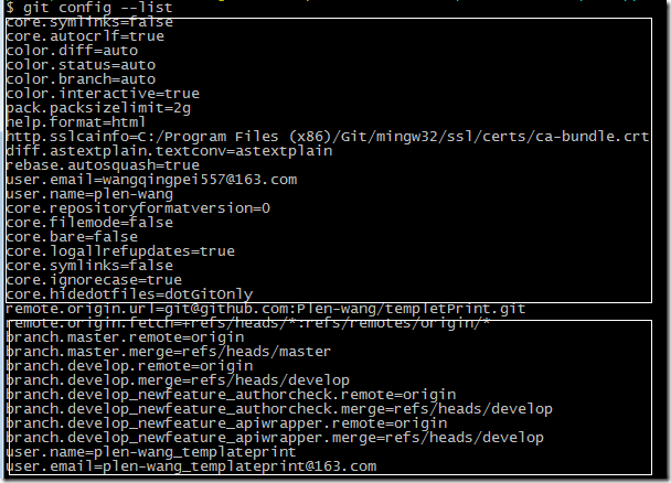 设置全局用户名、邮箱,git config --global user.name “plen-wang”,git config –global user.email “plen-wang@163.com”