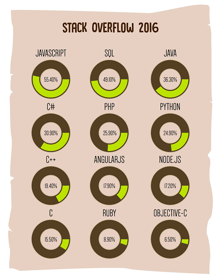 毫无疑问,JavaScript 已然成为当下最流行的编程语言之一,这点已经不需要争论了,不服的话前后端乃至全栈工程师肯定跟你急。最近, hackereart 就发表过一篇博文,文中描述了2016年主流编程语言的使用情况: