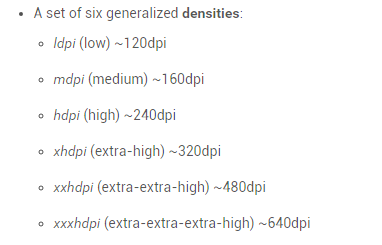 开发目录下会有个 drawable 或者 mipmap 目录用于适配不同 dpi 的屏幕,下面是不同命名目录所适配的 dpi 范围
