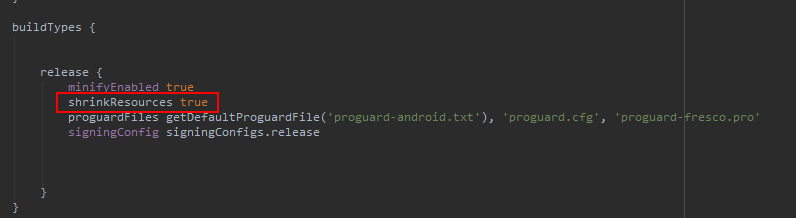 - 不打包没有使用的资源,在项目的 build.gradle 中配置 shrinkResources true 即可。