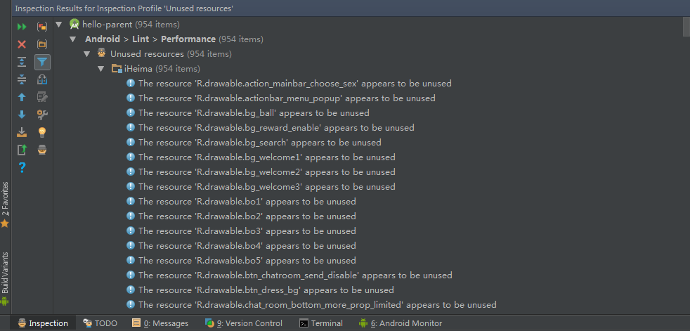 即可看到所有未使用的资源文件,建议定期清理掉这些没用的文件,一方面可以减小工程的大小,另一方面太多的资源文件会导致打包后 resources.arsc 文件变得越来越大,公司有一项目 resources.arsc 文件已经达到 2-3 MB 的程度,有点惊人。
