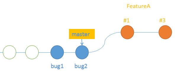 小李需要开发FeatureA,因此他在项目主分支的基础上新建了一个FeatureA的分支开始了他的工作,在他工作的同时,同事修复了两个bug,并且都合入了主分支,于是代码分支变成 了下面这种情况:
