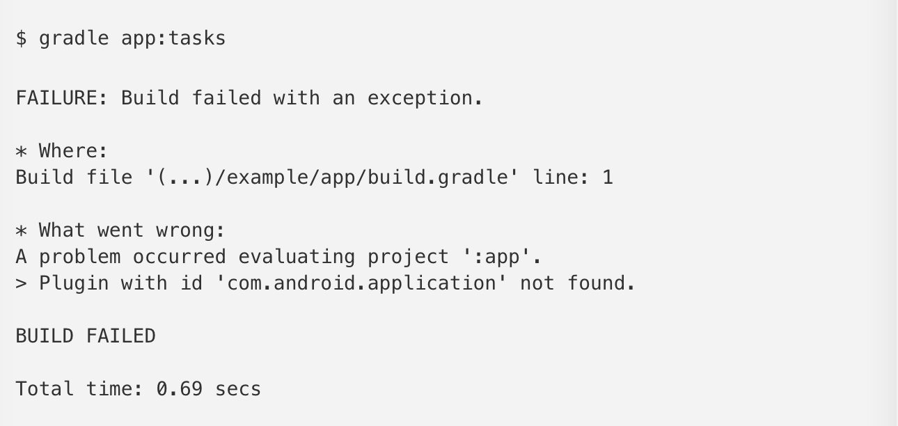 报错了,找不到 com.android.application 的定义,这不奇怪,我们并没有配置,但是gradle是如何查找Android的plugin jar包呢?在 user guide 可以找到答案,我们需要配置plugin的路径。