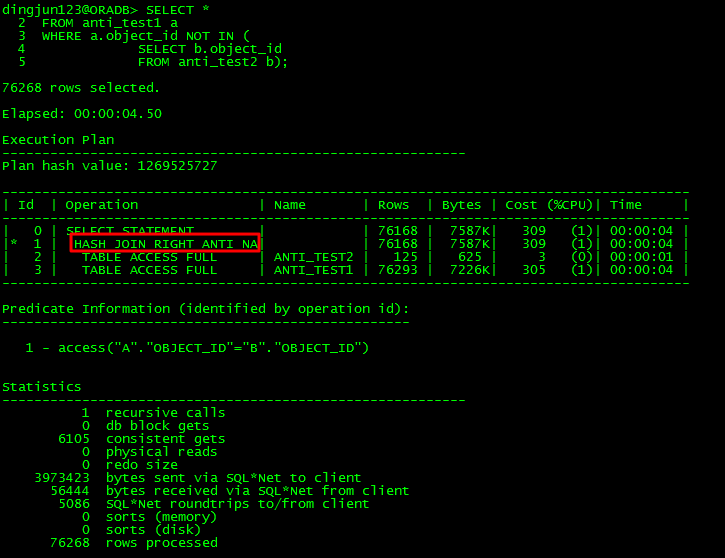 • 将NOT IN部分的匹配条件,针对本例就是ANTI_TEST1.object_id和ANTI_TEST2.object_id均设为NOT NULL约束。