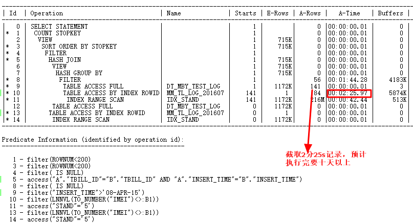 使用ALTER SESSION SET STATISTICS_LEVEL=ALL;截取2分25s的记录查看实际情况,ID=9步骤的CARD=141行就需要2分25s,实际此步骤有:27w行