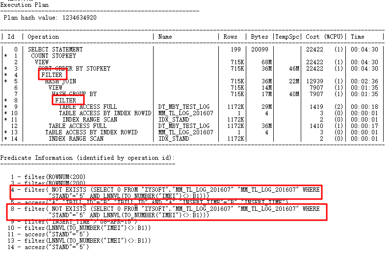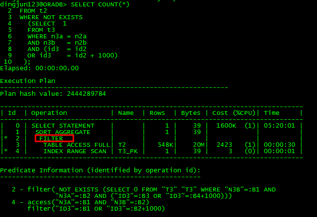 2. 有多个子节点,那么就是类似NESTED LOOPS操作,只不过与NESTED LOOPS差别在于,FILTER内部会构建HASH表,对于重复匹配的,不会再次进行循环查找,而是利用已有结果,提高效率。但是一旦重复匹配的较少,循环次数多,那么,FILTER操作将是严重影响性能的操作,可能你的SQL几天都执行不完了。