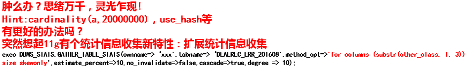 找出问题根源后,逐步解决。首先要解决ID=6部分针对DEALREC_ERR_201608表按照查询条件substr(other_class, 1, 3) NOT IN (‘147’,‘151’, …)获得的cardinality的准确性,也就是要收集统计信息。