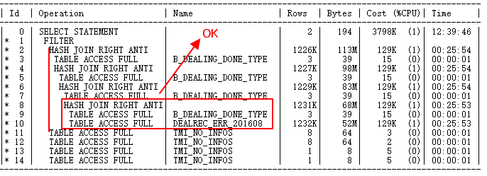 • 很显然,ID=2部分的一堆NESTED LOOPS也是很可疑的,找到ID=2操作的入口在ID=6部分,全表扫描DEALREC_ERR_201608,估算返回1行,很显然,这是导致NESTED LOOPS操作的根源,因此,需要检验其准确性。