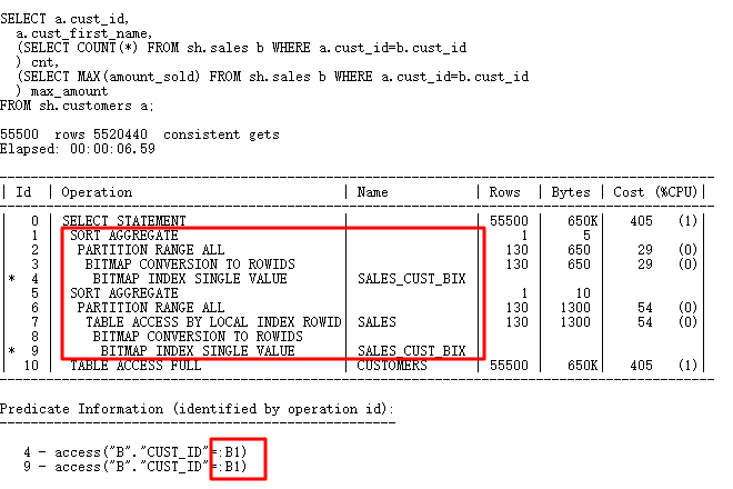 标量子查询的计划和普通计划的执行顺序不同,标量子查询虽然在上面,但是它由下面的CUSTOMERS表结果驱动,每行驱动查询一次标量子查询(有CACHE例外),同样类似FILTER操作。