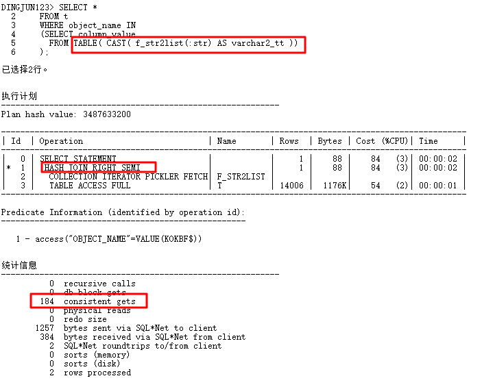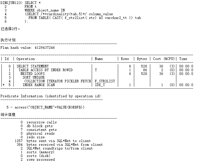从上面结果看出,TABLE函数的默认行数是8168行(TABLE函数创建的伪表是没有统计信息的),这个值不小了,一般比实际应用中的行数要多的多,经常导致执行计划走hash join,而不是nested loop。怎么改变这种情况呢?当然可以通过hint提示来改变执行计划了,对where in list,常常使用的hint有: