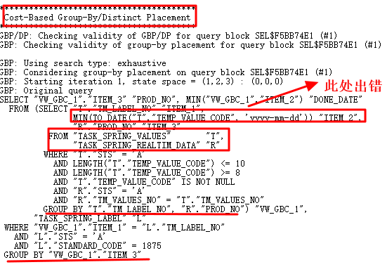 的确找到非yyyy-mm-dd格式字符串,因此,to_date操作失败。通过10053可以看出,这里使用了Group by/Distinct Placement操作,因此,需要找到对应的控制参数,关闭此查询转换。