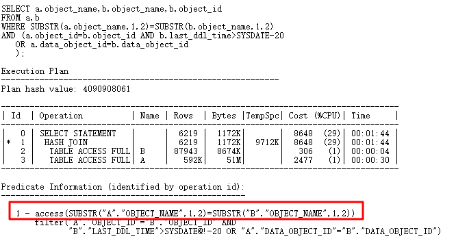 Oralce为什么选择substr(b.object_name,1,2)来构建HASH表呢,如果能将OR展开,原始SQL改为一个UNION ALL形式的,那么HASH表可以采用substr(b.object_name,1,2)和b.object_id以及data_object_id来构建,那么必然唯一性很好,那应该可以解决hash collision问题,改写如下: