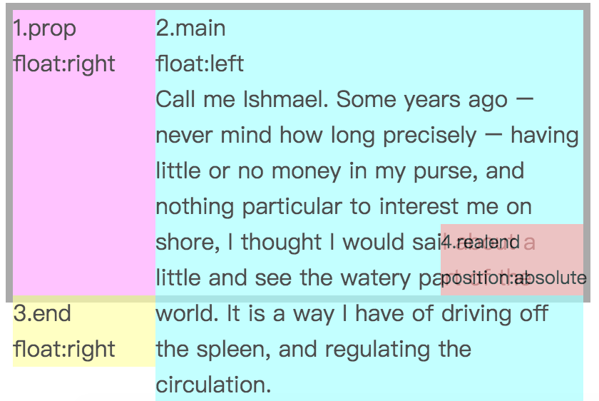 这一步中,我们主要关心的是realend元素的定位,基于浮动后的end元素设置偏移量,当end元素浮动到第一节第二章图的位置时(即在prop元素的下方),此时realend元素正好处在end元素的上方50px,右侧300px-100px=200px处,而该位置正是父包含框wrap元素的右下角,此时正是我们期待的结果: